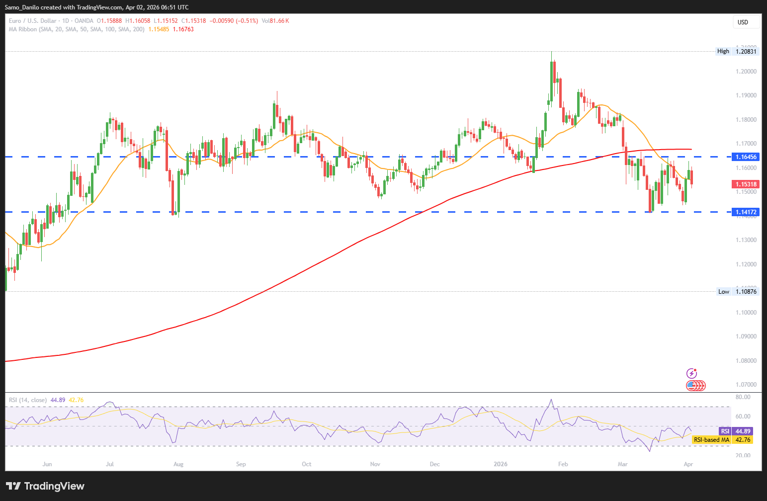 - EUR/USD Price: The EUR/USD failed to sustain its recent upward momentum and dropped below the 1.1550 level during the European session. The pullback reflects renewed USD strength and cautious market sentiment.