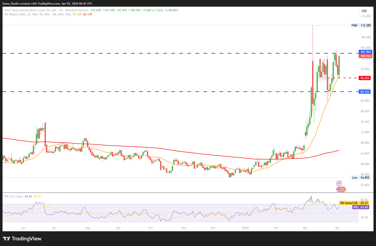 - Crude Oil Price: The WTI Crude Oil surged toward the $100 mark, supported by renewed geopolitical tensions following updates from Donald Trump on the Iran conflict. Escalation fears continue to drive a strong risk premium in oil markets.
