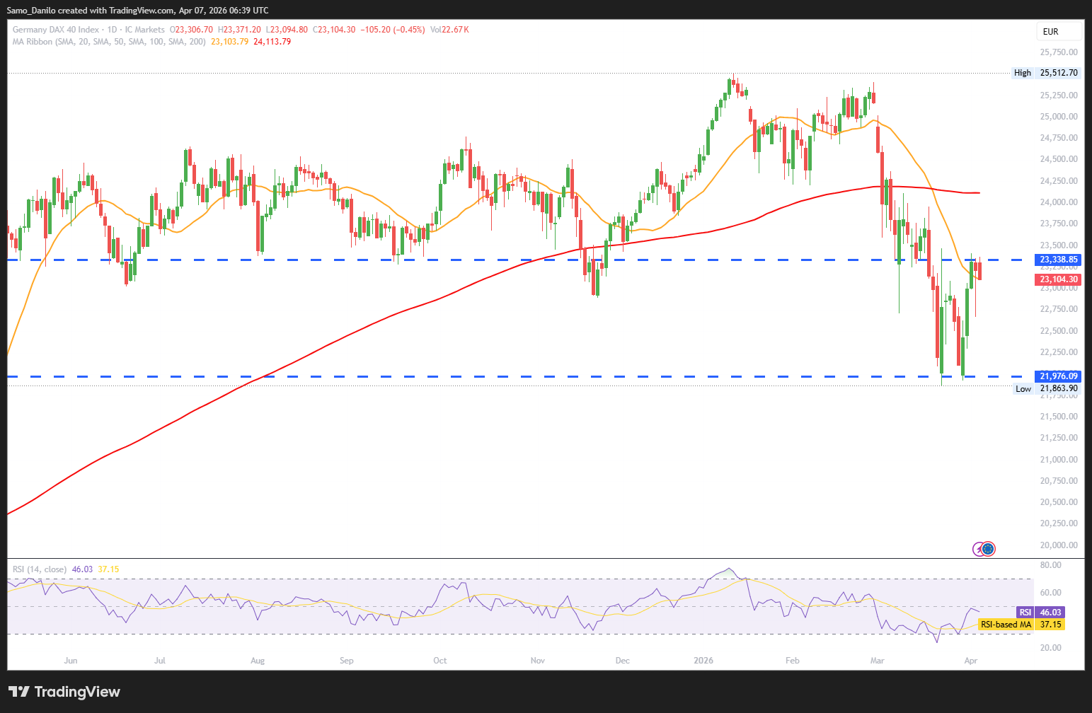 - DAX 40 Price: The DAX 40 is expected to trade largely unchanged after the long Easter weekend, hovering around 23,100 points. This suggests a cautious tone as markets reassess global developments.