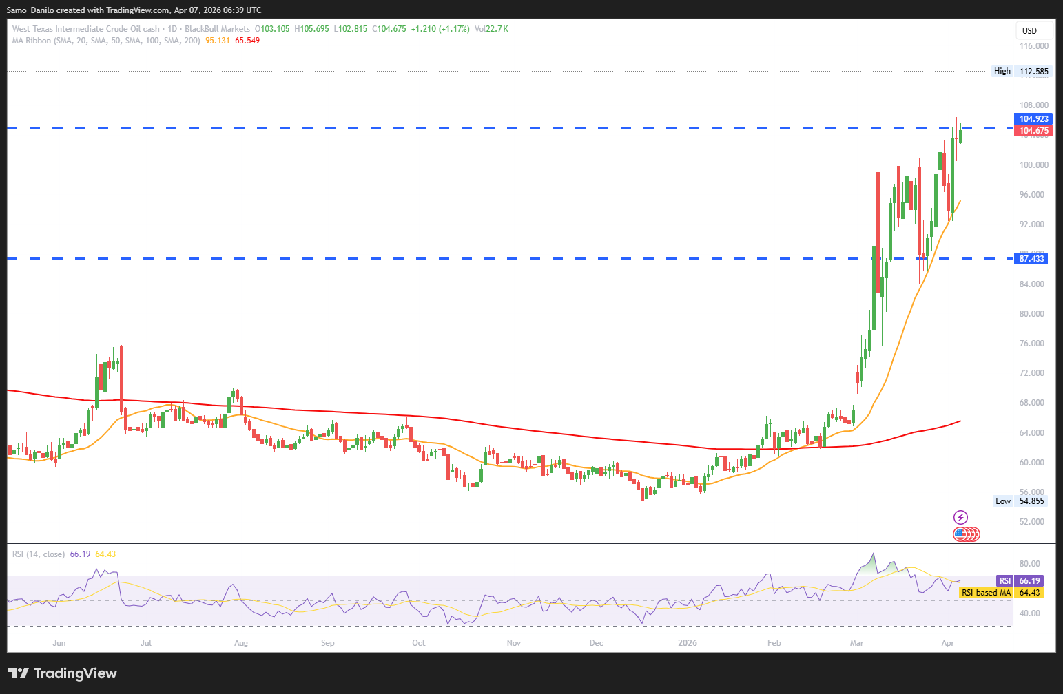 - Crude Oil Price: The WTI crude oil is climbing back toward recent highs, trading near $104.80 per barrel. Strong buying interest reflects persistent supply concerns and elevated geopolitical risk.