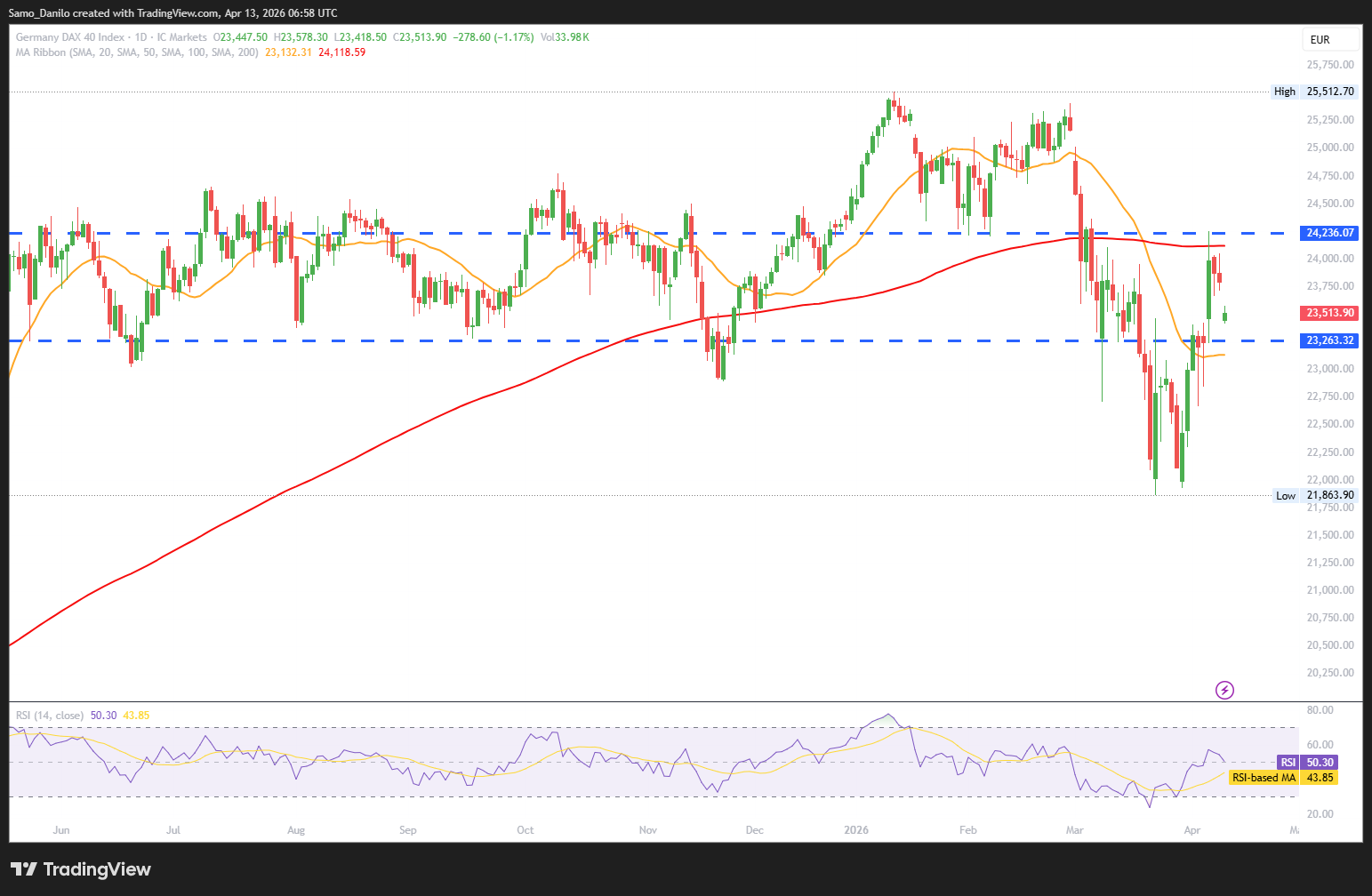 • DAX 40 Price: The DAX 40 is trading around 23,570 points, showing relative stability despite a challenging macro and geopolitical backdrop.