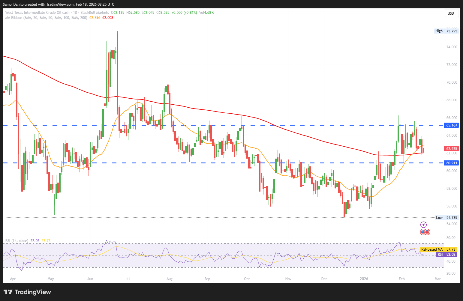 Closing statement: WTI remains range-bound, with downside pressure from resilient Russian supply and rerouted exports offset by persistent geopolitical risks tied to sanctions enforcement and attacks on energy infrastructure. Unless peace talks yield unexpected progress or supply disruptions escalate materially, crude prices are likely to hover near current levels with a cautious bearish bias.